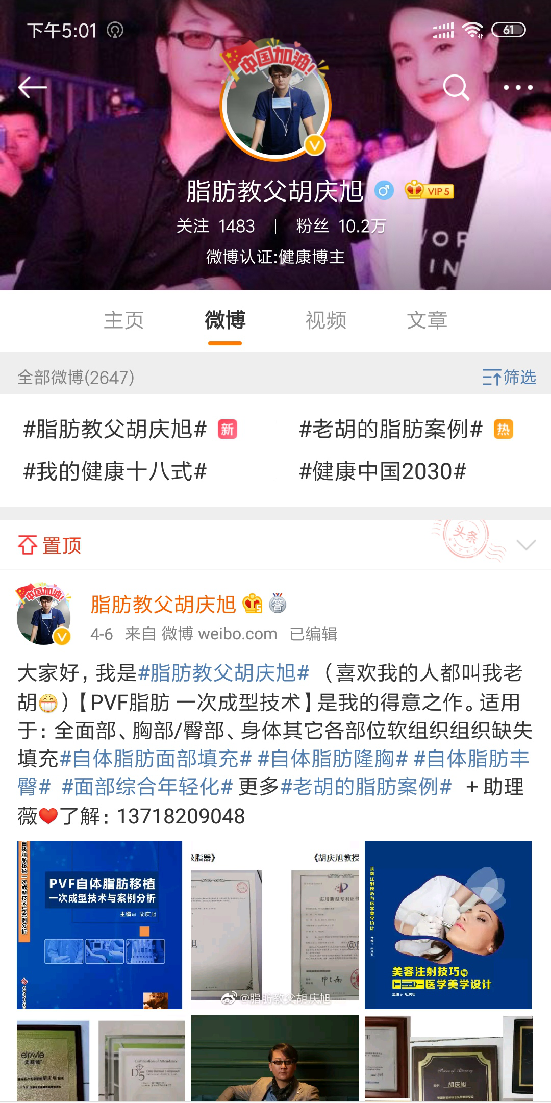 后来通过我们其他主播朋友了解到了北京的胡庆旭教授,专做脂肪项目,什么自体脂肪填充,全面部,隆胸,丰臀,吸脂这些。还出了自己的专利书籍,在网上也很有名,叫脂肪教父胡庆旭,已经有10w多的粉丝了。