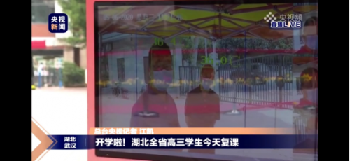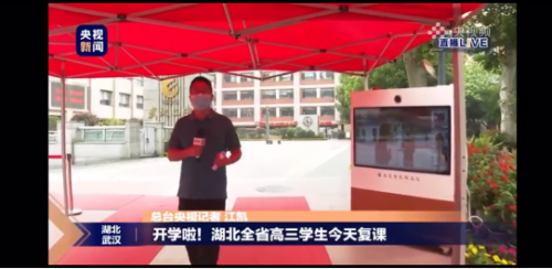 5月6日,武汉全市普通高中高三年级、中职学校和技工学校毕业年级统一开学,5万多名学生返回阔别许久的校园,正式复学复课。早上,央视新闻频道记者专程来到武汉二中,对毕业年级高三学生返校复课情况进行了现场直播采访,并在学校大门口防控区域亲身体验了亘星智能测温仪的测温效果。