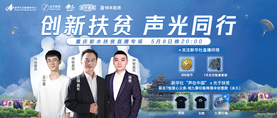 直播活动以“创新扶贫 声光同行”为口号,以售卖由新华社“声在中国”栏目联合腾讯光子工作室群推出的T恤等文创产品及彭水县特色农副产品的形式助力扶贫。届时,彭水县县长石强将与快手和平精英主播王小歪(快手ID:www0-0www)、快手美食主播(诺爸)一点一点学厨艺(快手ID:ping98098)在线连麦,在直播带货的同时为广大网友展现彭水县的风土人情。此外,众多快手站内红人也将在直播间与大家连麦互动。