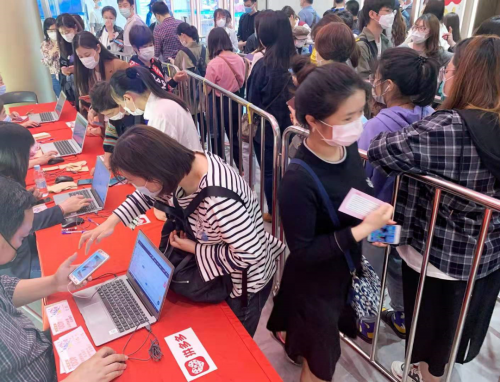 上海商场的五五购物节其实在5月1日就开始启动了,当天,拼多多开始发放65万张“五五购物节”的大额消费券,首批上线的新世界城10000张“300抵扣400现金”消费券,上线30分钟便遭抢购一空。