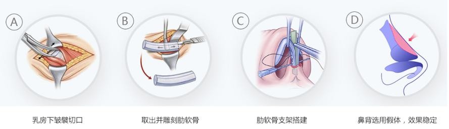 根据患者情况雕刻适合的假体,只在鼻骨和侧鼻软骨支撑力较强处放置小段假体,鼻翼软骨悬空处采用助软骨进行支撑加强鼻子原有结构,术后跟天生鼻子并无差异