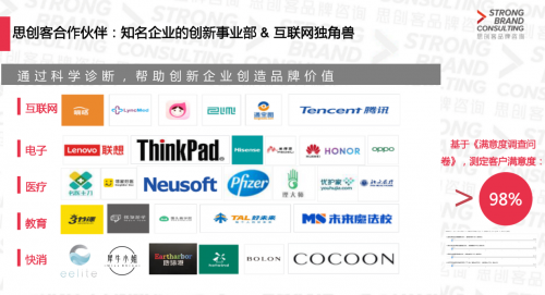 正是因为能够基于不同发展阶段,为企业提供更精准的品牌解决方案,思创客先后协助联想ThinkPad,OPPO,华为荣耀,好未来,大姨吗,嘀嗒拼车,热辣壹号,三节课,北大医疗,名医主刀等机构进行品牌系统完善;为百度,腾讯,阿里巴巴,小米,OPPO,热风,暴龙等企业提供品牌培训和教练辅导,更是国际创新创业博览会,优客工场,洪泰基金,青山资本,馒头商学院,有书,北大孵化器等机构的指定品牌合作伙伴。