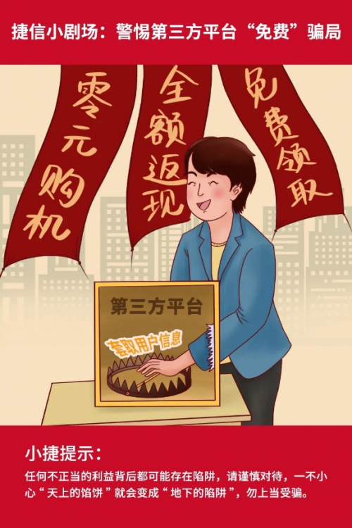 小捷提示:任何不正当的利益背后都可能存在陷阱,请谨慎对待,一不小心“天上的馅饼”就会变成“地下的陷阱”,勿上当受骗。这些打着“零元购机”旗号的第三方平台,实际上往往只是以“免费”作为噱头,套取受害者的敏感个人信息。除此之外,还有一些非法第三方平台承诺“购机全额返现”,却往往在几个月后就杳无音讯,说好的“返现金”也不翼而飞,受害者不仅要承受信息泄露的风险,个人财产安全也受到了侵犯。