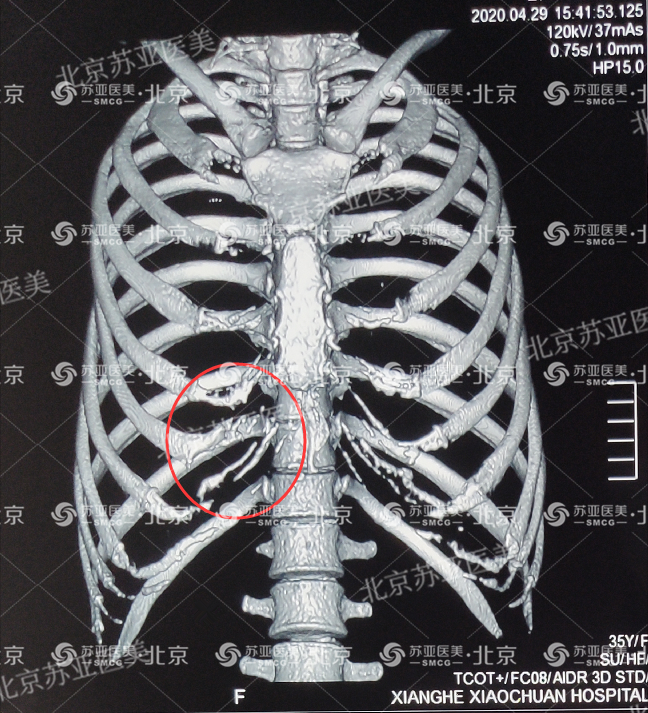 她说自己第一次做的是肋软骨隆鼻,这次还想取肋骨做修复,我们通过三维CT检测她的肋软骨已经完全钙化不能用(如下图圈内显示),沟通后她决定用选择异体肋软骨来替代。