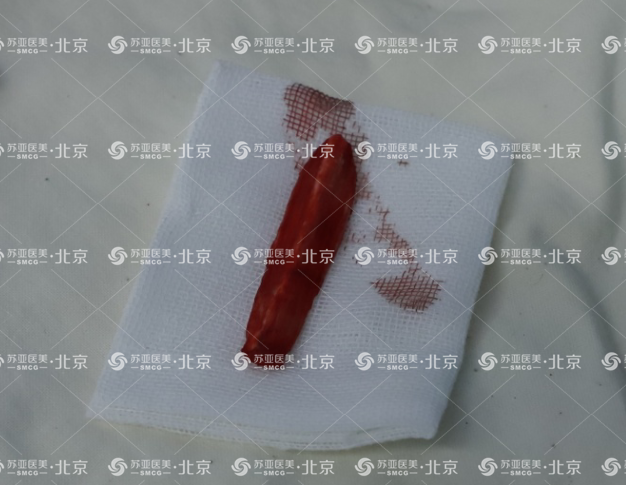 这次鼻修复手术中共施行了鼻部移植物取出术+异体骨鼻修复术+膨体鼻基底抬高修复术。在取出鼻部移植物的时候,我发现她之前移植的材料并不是肋软骨,而是硅胶(下图为取出的硅胶假体),作为整形医生,看到这一幕我们深深的心疼这个姑娘,同时也为第一个次给她做手术的医生感到羞愧,医者父母心,即使不能像爱惜自己的孩子一样爱护求美者,最起码也应遵守医生最基本的职业操守。