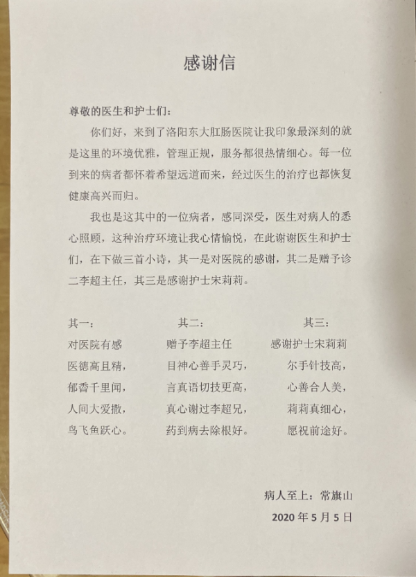 5月5日上午,一封感谢信在洛阳东大肛肠医院员工的朋友圈里火爆起来,原来是有一位患者写了一封感谢信并赋诗三首感谢我院以及两位医护人员。
