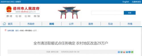 日前,德州市印发《关于加快推进2020年度清洁取暖建设工作通知》,明确2020年全市清洁取暖试点任务,城市(县城)新增清洁取暖面积382.26万平方米,农村地区清洁取暖改造29万户;城镇节能改造86.1万平方米,农房节能改造1万户。