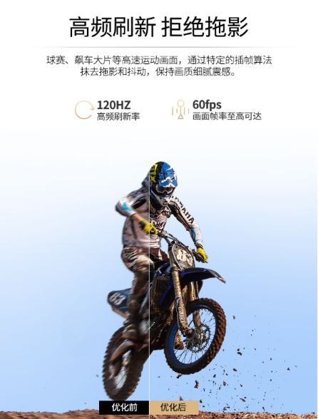 支持运动补偿技术,采用创新迭代软件算法,支持高达120Hz的高频刷新率,运动补偿处理能力较上代产品提升一倍,更好地解决高速运动画面中拖影等问题。同时,HDR+HLG双动态视频解码技术也能提供更好的分层和细节展现。