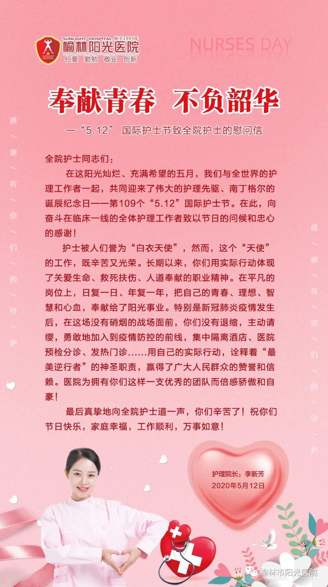 没有掌声、没有鲜花、没有待遇,甚至有时连尊严也没有,但这个职业非常伟大。今天,请将目光投向默默忙碌、可爱可敬的天使们,用一声感谢,一点理解,一份尊重,在属于他们的节日榆林阳光医院祝天下所有护士节日快乐,家庭幸福,工作顺利,完事如意!
