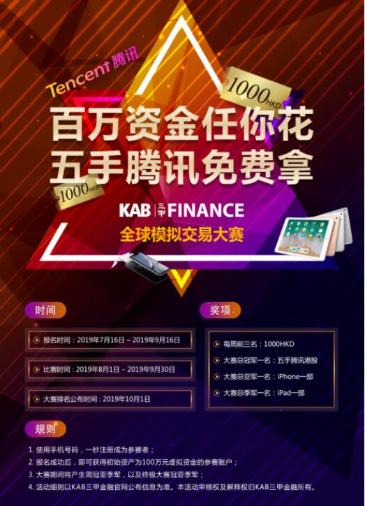 大赛期间,每周均产生3名周冠军,由三甲金融策略颁发1000元奖金。于10月10日公布的总决赛排名中,最终由选手ACCOUNT***113、ACCOUNT***237分别摘得亚军以及季军称号,并获得iPhone、iPad一部。超强选手ACCOUNT***017更是以总交易次数72次,最终净值223万的佳绩勇夺此次大赛冠军,由KAB FINANCE三甲金融策略颁发价值18万元的5手港股腾讯(以开赛时股价估算)。