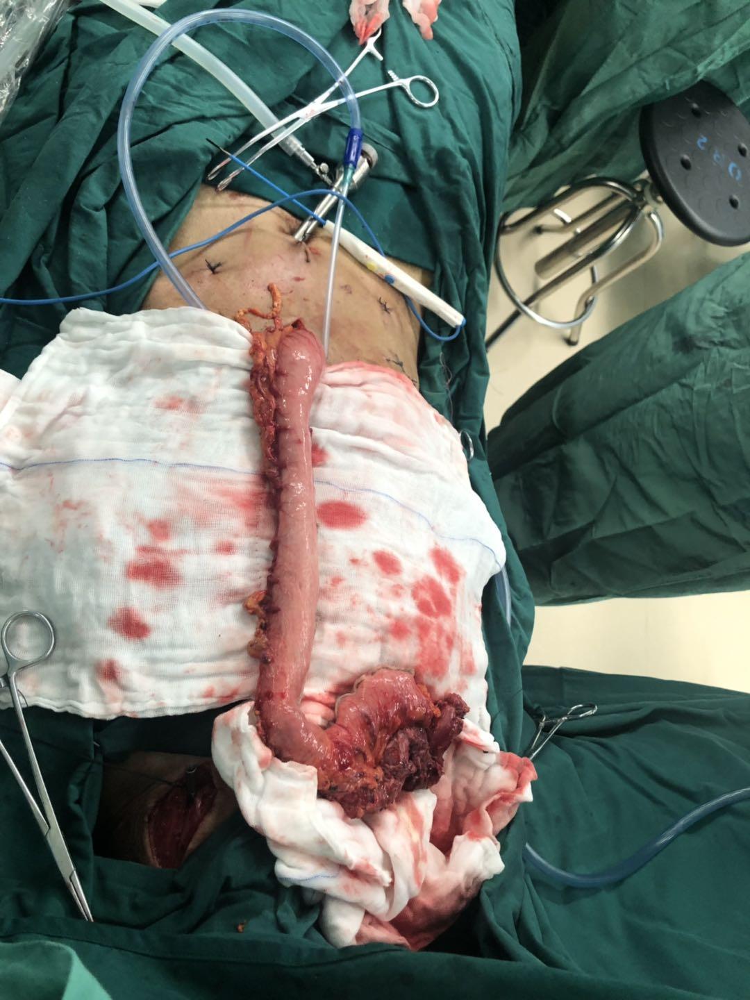 手术前胸外科医护人员向患者及家属充分宣教,提高患者对自身疾病的认知、缓解患者的紧张情绪。在充分的术前准备后,4月30日,患者接入手术室。手术由胸外科李学昌副主任医师主刀,胸外科手术团队和手术室医护人员精密配合,成功为患者实施了胸腹腔镜联合颈胸腹三切口食管癌根治术。