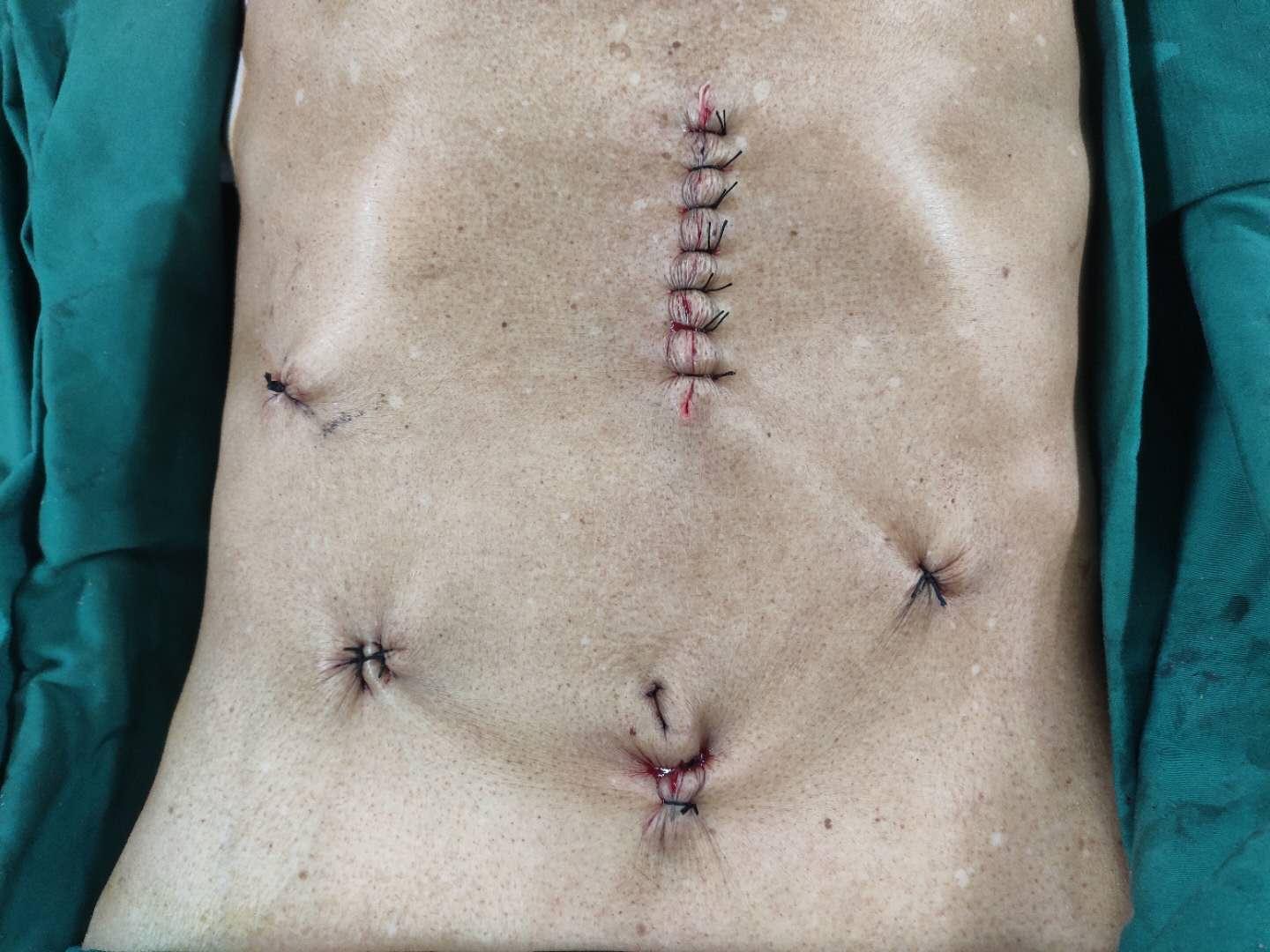 胸腹腔镜联合颈胸腹三切口食管癌根治术是使用胸腹腔镜完成食管癌的根治性切除的一种微创手术方式,是目前国内外最先进的食管癌微创根治术式,通过在胸部、颈部及腹部各开几个小口,然后放入腔镜,在镜下观察肿瘤情况,并在器械帮助下完整切除癌肿,同时进行相应淋巴结清扫以达到根治的目的。这种方式相比于传统的开胸手术,对于患者的身体损害更小,降低了术后并发症的发生几率,也为不能耐受“开大刀”治疗的患者提供了福音。我院胸外科利用该术式已成功为数例食管癌患者行根治手术,疗效满意。