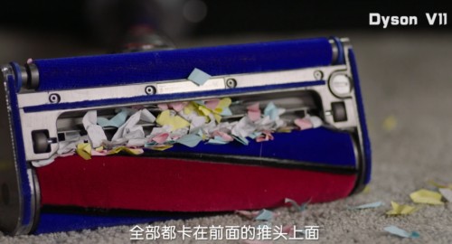 在测试过程中发现不少问题,比如吸力不足、吸头卡住,还有掉粉尘这种现象,这个原因有吸力的问题也有产品结构设计的问题,比如吸头的滚刷和灰尘入口之间的空间不够,垃圾不能快速的被吸附到管道内,导致垃圾堵在推头上面,俨然成为一把扫帚。