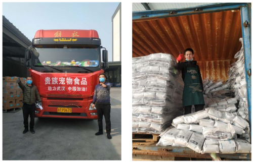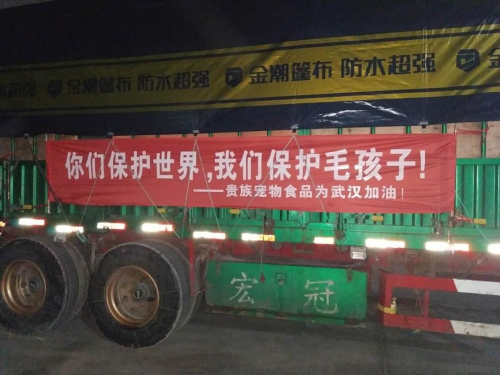 在所有人的不懈努力下,2月29日晚,第一辆满载贵族宠粮的货车从仓库驶出,用最快的速度奔赴武汉。这辆货车承载的不仅仅是11.1吨重的宠粮,更是所有贵族&爱哒哒人对武汉毛孩子满满的爱。
