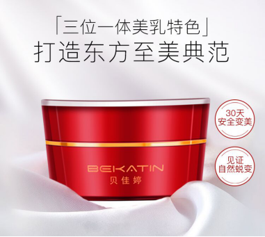 贝佳婷(bekatin)美乳霜整体采用展现女性魅力的石榴红设计,外观设计高端优雅,产品呈乳白色,质地柔软的乳霜非常的清透,感觉柔滑滋润感十分强烈,并带有淡淡的清香,PH值介于5至6之间,接近于人体平衡酸碱度PH5.5,性质温和,使用时胸部肌肤感舒适,毫无刺激感,适用于任何肌肤!
