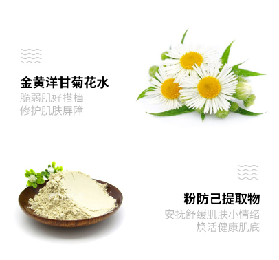 核心成分是金黄洋甘菊,备受护肤大牌钟爱的成分,众所周知还是敏感肌的救命神花,历史上洋甘菊还被誉为“植物医生”。能够很好的舒敏、修护敏感肌肤、减少细红血丝、减少发红、可平衡油脂分泌,增加皮肤自身保湿性,有效改善干燥皮肤和湿疹皮肤,坚持使用还可以达到美白的效果。