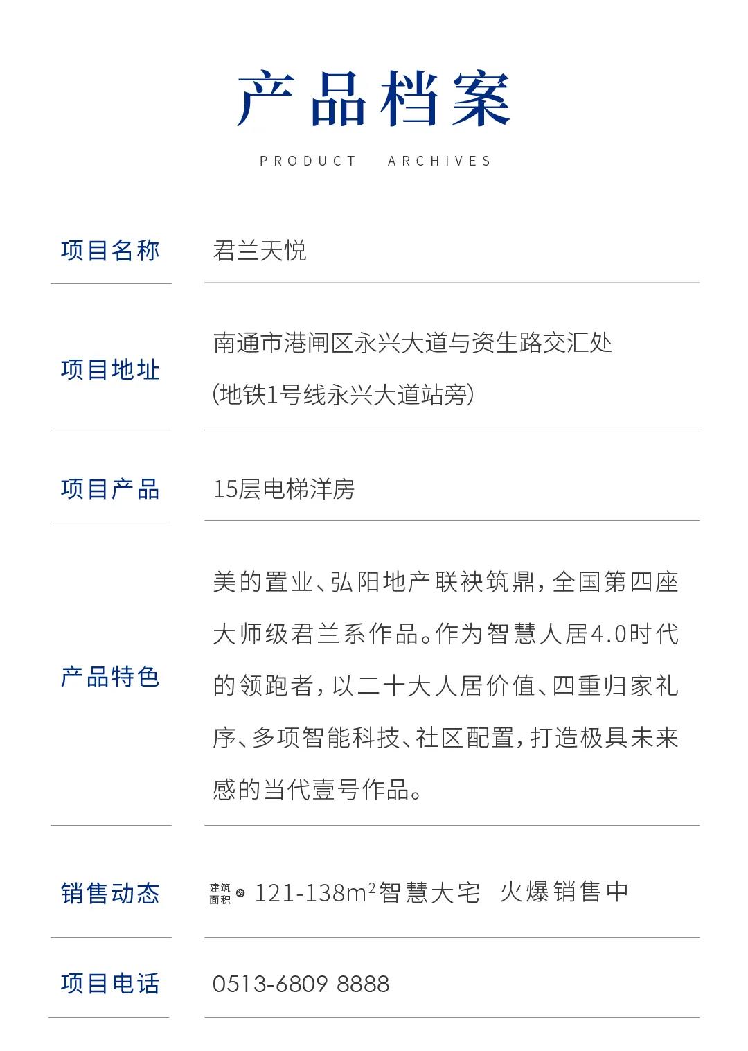 1、本项目推广名为“君兰天悦”;备案名为“君兰天悦花园”;开发公司为:“南通美弘房地产有限公司”;