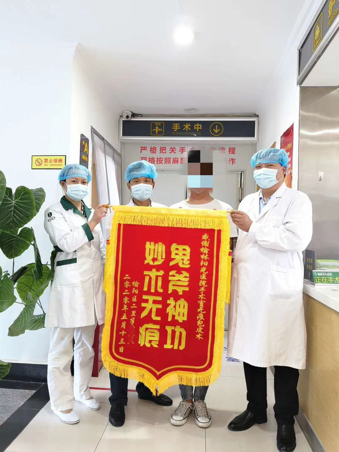 5月13日上午,家住榆林区的张先生(化名)手持一面上面书写“鬼斧神工、神术无痕”的锦旗热情的送到榆林阳光医院手术室,表达自己对榆林阳光医院手术王大夫的感谢,阳光医院的大夫们热情的接见了张先生,对张先生送来的锦旗表示感谢,并与张先生合影留念。