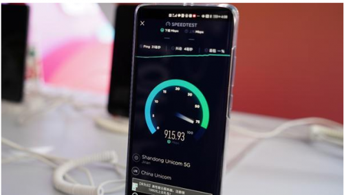 在紫荆山会场,除了有好看的网红打卡点以外,还可以体验配有5G网络的全新5G手机,让每个人把千兆下载速度的5G生活握在手中。现场联通5G测速,下行速度达到915Mbps。