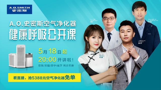 5月18日/21日/22日晚8:00,多名大咖将来到A.O.史密斯直播间现场,开启3节大咖健康呼吸系列公开课,届时将于京东/天猫/苏宁/云犀4大平台同步直播,邀您关注。