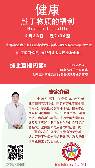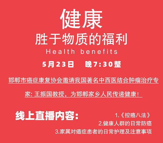 如何发现早期癌症?哪些生活习惯容易导致癌症?如何科学防癌控癌,这些问题一直困扰着人们,特别是新冠肺炎疫情限制了人们的出行,就医受到了限制。让久病居家的患者们和突发新症的朋友们忧心忡忡。这些情况得到了邯郸市癌症康复协会的关注,为此协会开展“为邯郸家乡人民传递健康”大型公益服务活动,本次活动将在5月23日举行,特邀北京中西结合肿瘤治疗专家王振国教授为邯郸市民做线上健康科普讲座。该协会会长王玉梅女士表示本次活动将结合大家关心的疫情期间肿瘤防治问题,谈一谈癌症患者如何科学控癌,癌症患者家属如何陪伴肿瘤患者,以及健康人士怎样预防癌症等问题,给大家带来一些科学的指导。