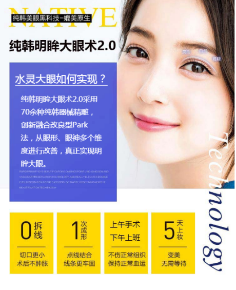 纯韩明眸大眼术2.0采用70余种纯韩器械精雕,创新融合改良型Park法,从眼形、眼神多个维度进行改善,真正实现明眸大眼。