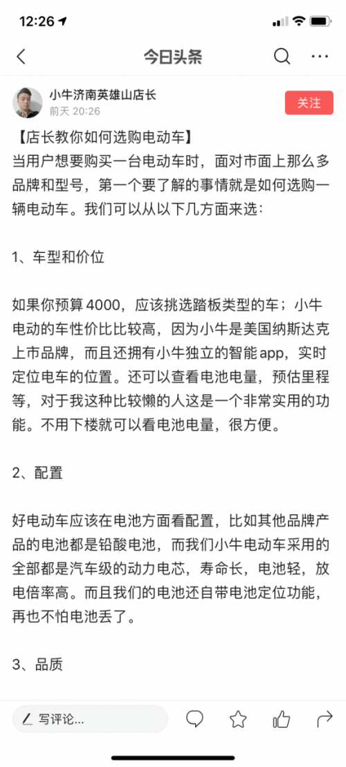 小牛电动店长入驻头条以后,我们消费者可以第一时间了解到小牛电动最新电动车的消息以及优惠活动,比如最近小牛要推出的新款新国标旗舰智能锂电电动车——小牛MQi2,可以第一时间去头条咨询小牛电动的入驻店长们。