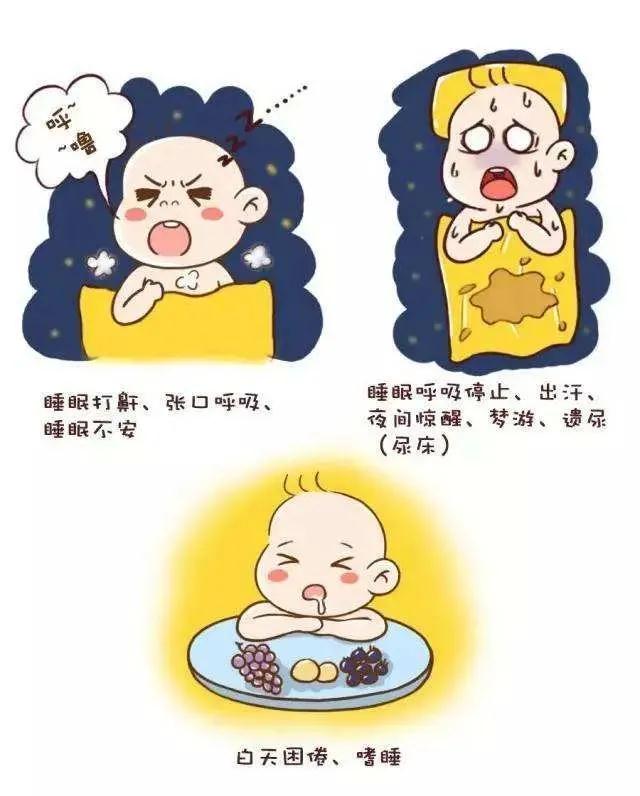夜间睡眠打鼾、张口呼吸甚至憋气为绝大部分患儿的主要症状。严重的可表现为一段时间呼吸暂停后猛烈地翻身甚至惊醒,长出一口气后再接着睡。部分患儿还表现出白天困倦嗜睡、注意力不集中;夜间多汗遗尿甚至梦游等。