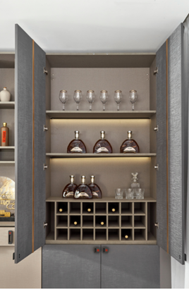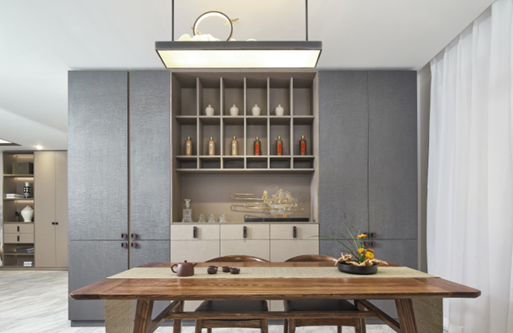 “酒柜是幸福生活浓缩的影子。透过酒柜,看生活品质”,酒柜不仅是收纳,是美好生活的追求、向往和憧憬,更是身份与尊贵的象征。柏厨集成家居“云涧”新中式风格酒柜,将传统元素与现代元素相结合,款式设计简约时尚,绒面质感、欧洲原版纸、双层压贴技术的门板饰面板,仿影木纹路,染色清新淡雅,逼真还原材质本来面貌,配色细腻典雅,营造出清新、淡雅的中式韵味,满足了绝大多数现代人的审美。