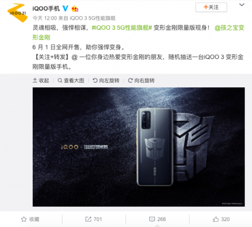 探索之心、敢越星辰,iQOO 3变形金刚限量版将于6月1日全网开售,作为iQOO粉丝的各位酷客们,可以准备出手抢购了。
