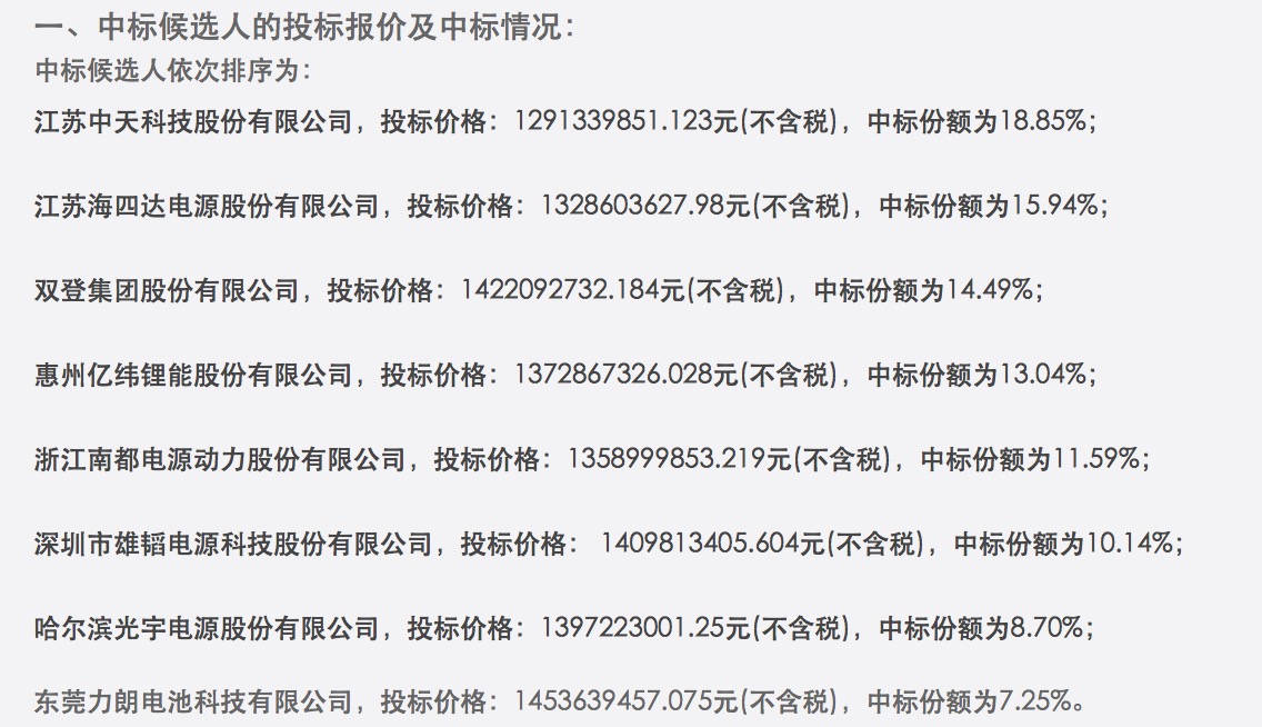 根据中国移动日前发布的《2020年通信用磷酸铁锂电池产品集中采购中标候选人公示》,江苏中天科技股份有限公司、江苏海四达电源股份有限公司、双登集团股份有限公司、惠州亿纬锂能股份有限公司、浙江南都电源动力股份有限公司、深圳市雄韬电源科技股份有限公司、哈尔滨光宇电源股份有限公司、东莞力朗电池科技有限公司等8家公司入围,最多中标份额为18.85%。