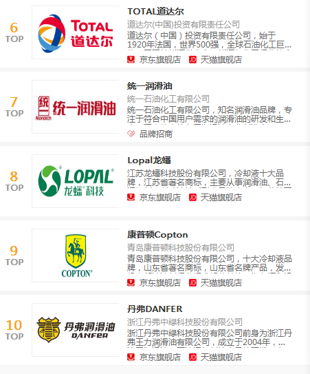 近日,2020年中国润滑油十大品牌发布,这是对中国润滑油行业品牌建设、社会责任、未来发展潜力及综合市场竞争力进行全面、科学、系统的调查研究、评选后发布的,参评范围是服务中国市场的近500家国内外润滑油品牌。壳牌、美孚、嘉实多、长城润滑油、昆仑、道达尔、统一、龙蟠、康普顿、丹弗位列中国润滑油行业十大。此次十大品牌的发布也旨在表彰用心经营且具备热诚、社会责任感以及品质优越的品牌。