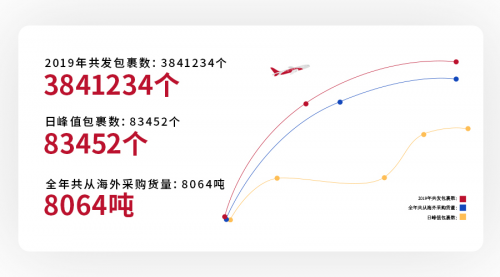 除了专业的客服团队,更重要的还有单创平台先进完善的供应链/物流系统。2019年,单创平台全年共从海外采购货量8064吨,可装满80架左右飞机。全年共发出包裹3841234个,日峰值包裹数83452个,物流单量位居宁波关区业务体量前五名。