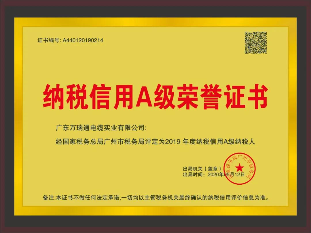 近日,本网编辑从国家税务总局官网上获悉,广东万瑞通电缆实业有限公司获评2019年度纳税信用A级纳税人。