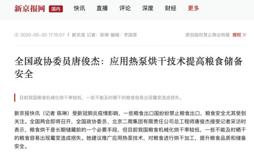 据新京报报道,全国两会即将召开,全国政协委员唐俊杰接受记者采访时表示,她建议推广应用热泵技术,对粮食进行烘干加工,提升粮食品质和储备安全。近几年,煤改清洁能源,各地明令禁止使用燃煤热风炉作为热源。使用热泵烘干技术在节能、环保和高效方面优势明显。热泵技术供热效率达到电加热的3-7倍,比传统燃煤烘干节能率高出40%~70%。