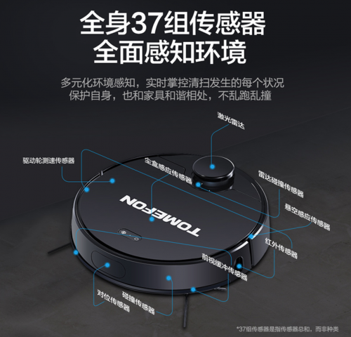 扫地机器人除了规划清扫以外,还需要多种传感器来辅助扫地机器人进行清扫,比如悬崖传感器、红外回充传感器、水箱在位传感器、尘盒在位传感器等等。斐纳TOMEFON扫地机器人拥有37种传感器,可以让扫地机器人在清扫的时候能更加聪明。
