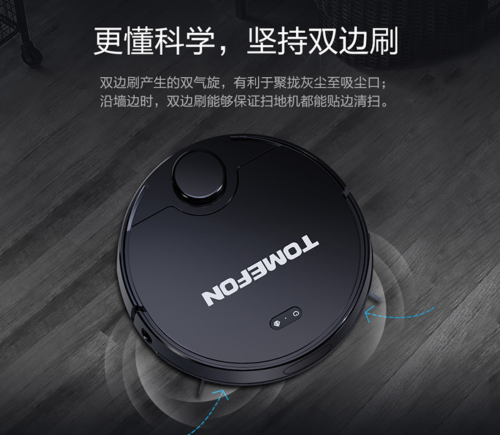 斐纳TOMEFON扫地机器人采用双边刷模式,在清扫的时候能更加快速的做到聚尘效果,能快速的把垃圾都打进吸尘口,通过强大的吸力把垃圾吸进尘盒。