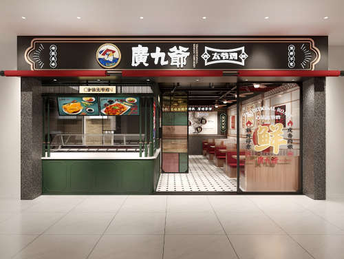 好的店面是成功的一半,店面设计给人的整体感觉,能够体现店面的档次和个性,广九爷古法太爷鸡门店设计有着浓厚的粤港风味,明档堂食兼具,邮政绿和暗绛红的搭配体现出古法传承的历史感,店铺内暖色灯光将衬托出温暖的感觉,墙壁上“我好中意”点缀装饰,与食客品尝时的感受相映成趣。