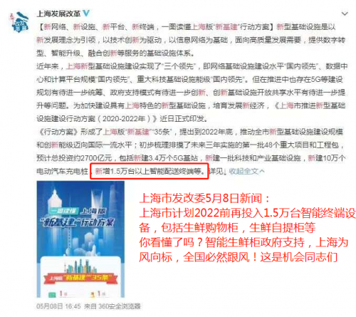 5月7日举行的上海市政府新闻发布会上,《上海市推进新型基础设施建设行动方案(2020-2022年)》正式发布。其中市商务委副主任周岚表示:“未来上海将进一步推动智能末端配送设施的发展,在强化末端配送服务智慧化建设的同时,加大智能售货机的投放力度。目前在已试点投放“无接触配送”智能售货机组件的基础上,新增1.5万台以上智能售货机,加大对医院、学校、办公楼、大型社区等区域的覆盖力度。推动多方合作、统一布设用于药品、商超用品、蔬菜鲜果等不同品类物件的多功能柜。加快智能售货机、无人售货柜、智慧微菜场、智能回收站等各类零售终端在市场上的布局,着力提升智能化、集成化和综合化服务功能。争取在三年内新增智能售货机1.5万台以上,构建覆盖15分钟生活圈及住宅小区的智能末端配送体系”。