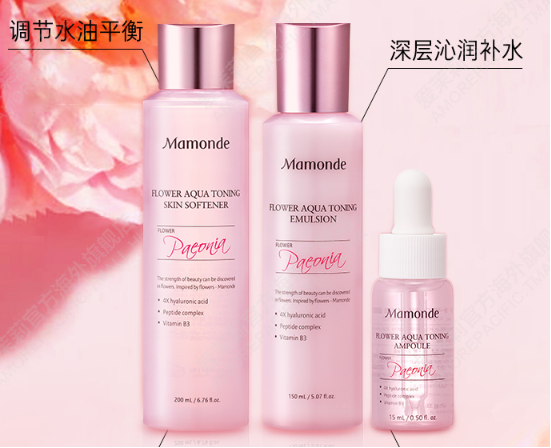 另外还有一个重磅套装,就是我们的Mamonde梦妆花漾沁润水乳安瓶3件套装,这款水乳套装拥有深层滋养舒爽嫩滑的功效,提取“花中之王”牡丹的根部活性成分“丹皮酚”,融合多重萃取工艺,带来深层滋养嫩滑的效果,透现肌肤粉亮光彩,并且根据临床测试,使用4周后,肌肤状况具有明显的改善,重回年轻好肌肤。日常销售价269元,预售价只需243元。