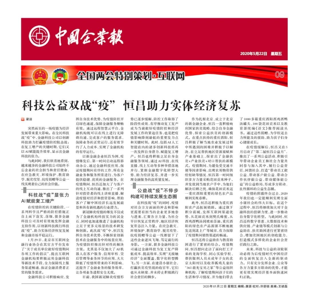 以新金融企业恒昌为例,疫情爆发后,第一时间启动远程移动办公,通过金融科技应用,保证疫情期间有序的工作,所有金融业务和服务照常进行,为客户提供稳健、优质的金融服务。在疫情期间,恒昌还加大了与客户的线上互动沟通,推出了一系列针对投资者的线上讲座直播,解读疫情对经济和投资影响,帮助客户了解中国经济长远发展前景和具有新机遇的行业潜力。