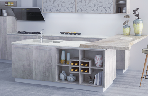 简约的视觉设计并不代表简单的功能实现,醉花间有着现代厨房该有的一切功能。人机工程学半高柜内嵌拉篮,充分扩展地柜的存储空间,打开柜门后层板中会有晶莹的灯光自动亮起,非常方便使用;岛台配置了获得专利的独特工艺田字柜,增大储物空间同时又便于主人拿取东西,这里还是一个小型的开放式酒柜,随着人们生活水平的提升,酒柜也成为了家庭标配,闲暇时独自小酌或是三五好友对饮,颇有追访古人“醉卧花间”的风流;