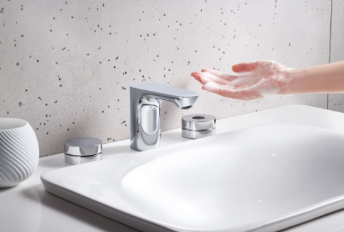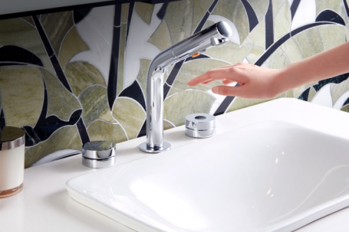 科勒艺廷三孔感应脸盆龙头: 与传统款一致的经典造型,灵敏免触感应,预设温度流量,自由控制水流时长。
