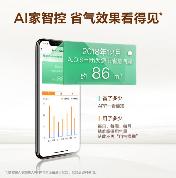不仅如此,此款采暖新品还搭载智能双向通讯型温控器,实时反馈室内温度给控温中枢,联动感应室外温度的传感器,自发启动SHC气候补偿技术,避免采暖水温频繁波动造成的浪费。A.O.史密斯为采暖新品搭配的手机远程智控系统,升级版AI算法后台同步运行,用户手机APP即可查看家里用气省气数据,从每日到每月的数据分析一目了然,即刻体验前所未有过的节能省气可视化效果。从源头解决采暖系统设备间节能联动性差的现状,令用户无需多虑采用何种方式才能降低采暖花费,实现真正意义上的全屋采暖系统高效节能。