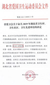 经市爱卫会考核和推荐,湖北省爱卫会审核,我院被省爱卫会授予“湖北省卫生先进单位”称号。