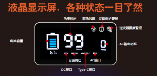 液晶显示屏,各种状态一目了然。分别显示“电池容量”、“AC输出功率”、“功率时间”、“过载保护警报”、“逆变器温度警报”以及各输出接口显示,