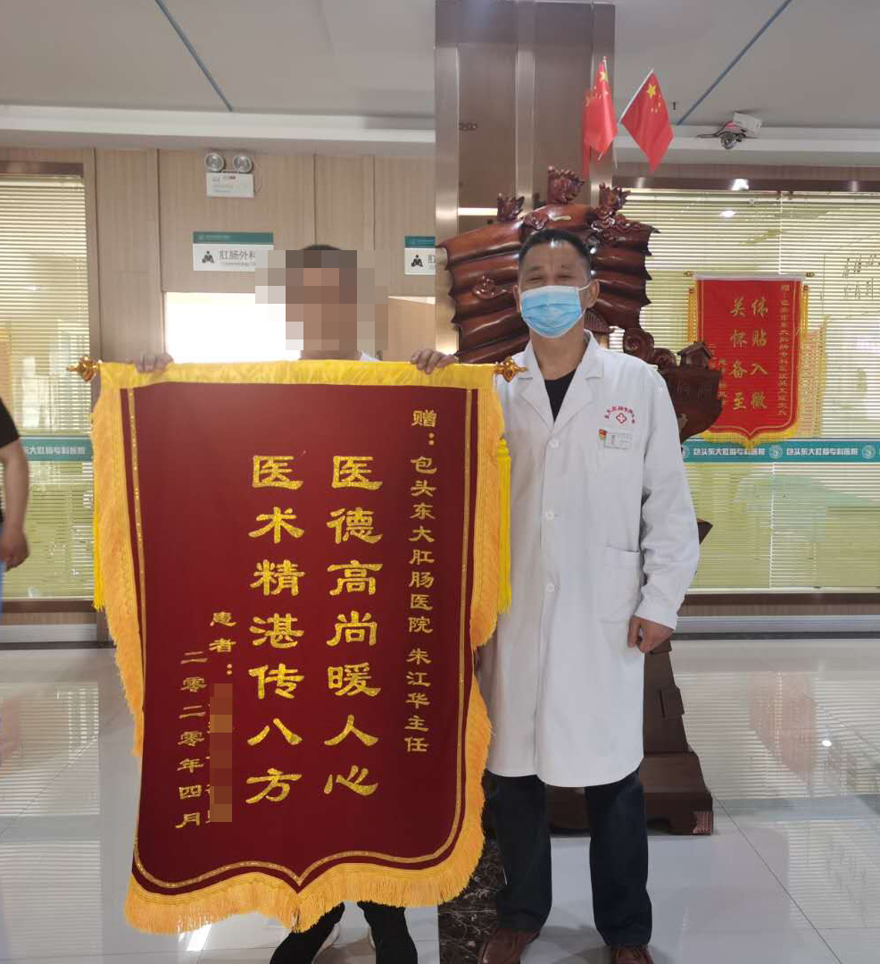 据了解,这位送锦旗的先生姓闫,肛门出现疙瘩一直出脓,现在旁边又出现一个,之前一直没有当回事。一直反反复复,时轻时重。随着时间的推移,肛门外溢的分泌物越来越多。无意间听别人说肛瘘不是小问题,长时间炎症刺激可能出现肛管癌,肛瘘手术复发几率高,经多方和网络了解到全国肛瘘防治委员朱江华主任在我院,就通过网络预约了朱主任的号位。