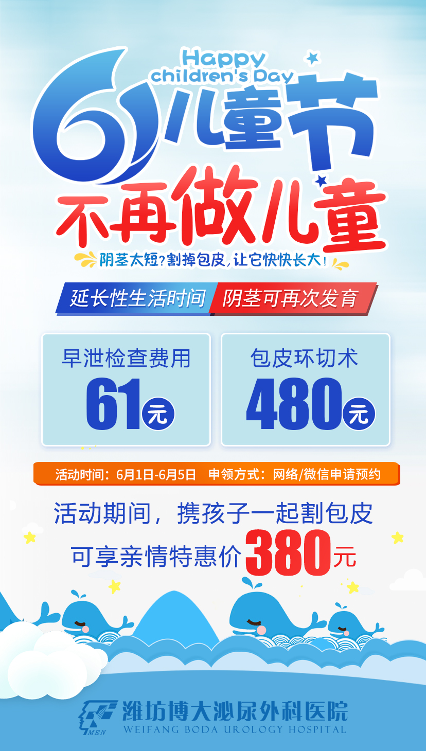 儿童节,别再让他做“儿童”了,给孩子一份健康大礼,割掉包皮,让阴茎“放肆的生长”。这对孩子的生长发育、将来的幸福,以及未来的家庭而言,都是一个伟大的健康工程。为了孩子的健康和幸福,潍坊博大男科医院推出6·1儿童节割包皮亲情特惠价,割包皮低至380元,20-30分钟,就可做完手术,给孩子一生的幸福。 面对孩子的生殖健康问题,作父母的应该负起责任,莫要给孩子以后的成长留下不可弥补的缺陷。