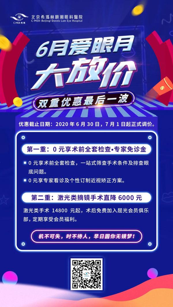 不知不觉,2020年行至中点。6月的“爱眼月摘镜·享清晰视界”活动将是激光类近视手术优惠6000元的最后一期!!!此后激光类近视手术优惠将回归4000元档,希望各位期望摘镜的朋友们,能抓住这最后一波难得的特惠,轻松重返清晰视界!