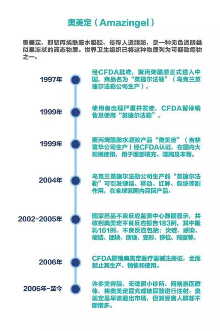奥美定,学名聚丙烯酰胺水凝胶,也叫英捷尔法勒,是乌克兰英捷尔法勒公司生产,1997年12月经国家药监局批准,用于注射丰胸、丰臀、隆鼻、丰太阳穴以及各种软组织凹陷填充。奥美定本身是一种无色透明类似果冻状的液态物质,而且本身不会被身体吸收,随着我国大范围的使用,奥美定的危害渐渐浮出水面,它在人体内分解后会产生神经毒素,影响人的神经系统,造成内分泌紊乱,并且还会不断的侵蚀周围的组织,并发症频发,2006年4月30日,国家食品药品监督管理局全面停止其生产、销售和使用。